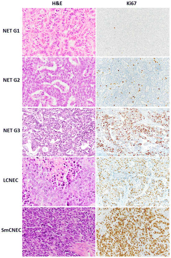 Gastric NETs are categorized into three types by the Rindi Classification and are also graded into three tumor classifications by the World Health Organization (WHO). Grade 1 (G1) tumors have a Ki67 proliferation index of <3% and mitotic index per high power field of <2 mitoses/2 mm2, Grade 2 (G2) tumors have a Ki67 proliferation index of 3–20% and mitotic index per high power field of 2–20 mitoses/2 mm2, and Grade 3 (G3) tumors have a Ki67 proliferation index of >20% and mitotic index per high power field of >20 mitoses/2 mm2 [,]. Neuroendocrine carcinomas (NECs) are additionally defined by WHO by having high-grade features and are subclassified as small- or large-cell types (SmCNEC, LCNEC) [] (Table 1, Figure 1).