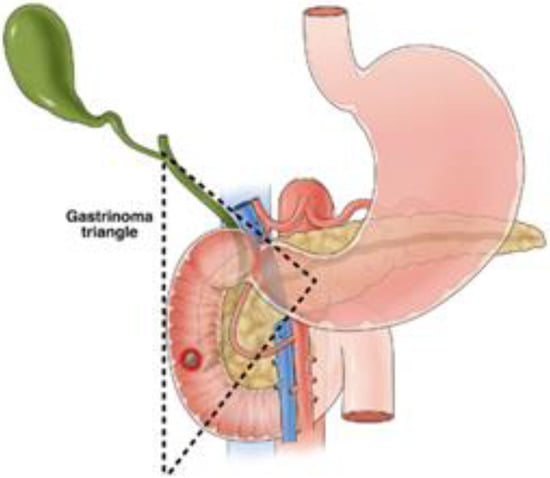 - Stabile, B.E.; Morrow, D.J.; Passaro, E., Jr. The gastrinoma triangle: Operative implications. Am. J. Surg. 1984, 147, 25–31. [Google Scholar] [CrossRef]