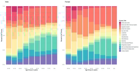 In general, males had an overall observed higher cancer incidence at all sites and age groups. The exception to this was in those aged 20–29 years and 30–39 years, (Supplementary Table S1). Females who were either 20–29 years or 30–39 years had a higher incidence across all primary sites than males within the same age group (M:F IRR: 0.71; 95% CI: 0.70–0.71; p < 0.001; M:F IRR: 0.81; 95% CI: 0.80–0.81; p < 0.001, respectively). Incidence across all primary sites varied widely between both age and sex (Figure 1). For example, endocrine system cancers accounted for 33% of all tumors for females aged 20–29 years and 30–39 years (N = 54,732, N = 104,852, respectively) (Figure 1). In contrast, endocrine system cancers accounted for 10% of all tumors for males aged 20–29 years (N = 11,530) and 9% for males aged 30–39 years (N = 24,226) (Figure 1).