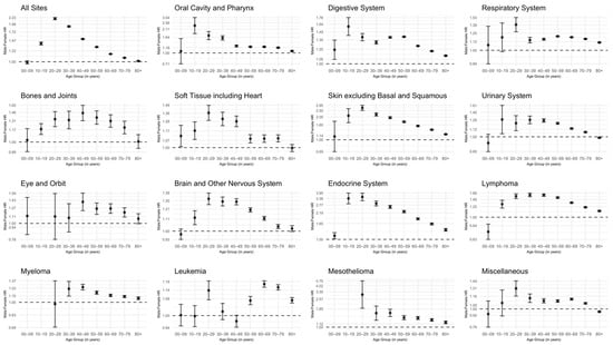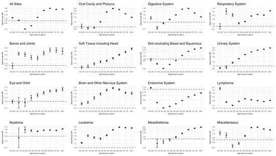 Highest M:F IRRs were seen in those diagnosed with mesothelioma at an older age (60–69 years M:F IRR: 3.79; 95% CI: 3.63–3.97; p < 0.001; 70–79 years M:F IRR: 4.66; 95% CI: 4.48–4.84; p < 0.001; 80+ years M:F IRR: 5.48; 95% CI: 5.25–5.71; p < 0.001) (Figure 2). Endocrine cancer, in those 20–29 years, had the lowest M:F IRRs were lowest (M:F IRR: 0.20; 95% CI: 0.20–0.21; p < 0.001) (Figure 2). A higher incidence of oral cavity and pharynx cancers was found in females aged 10–19 years and 20–29 years (M:F IRR: 0.92; 95% CI: 0.86–0.99; p = 0.029; M:F IRR: 0.96; 95% CI: 0.91–1.00; p = 0.078, respectively) (Figure 2). In general, males had a higher incidence of digestive system cancer. Digestive system cancers were higher in males. The exception to this was in those aged 10–19 years and 20–29 years (M:F IRR: 0.81; 95% CI: 0.77–0.85; p < 0.001, M:F IRR: 0.96; 95% CI: 0.94–0.98; p < 0.001, respectively) (Figure 2). For skin cancer, excluding basal and squamous cell skin cancer, M:F IRRs were highest within those aged 70–79) and 80+ (M:F IRR: 2.28; 95% CI: 2.26–2.30; p < 0.001; M:F IRR: 2.52; 95% CI: 2.49–2.54; p < 0.001, respectively) (Figure 2). Soft tissue cancers had the highest M:F IRRs, specifically among those aged 70–79 and 80+ (M:F IRR: 1.6; 95% CI: 1.59–1.68; p < 0.001; M:F IRR: 1.81; 95% CI: 1.76–1.86; p < 0.001, respectively) (Figure 2). When analyzing those age 70–79 and 80+ years, eye and orbit cancers had the highest observed M:F IRRs (M:F IRR: 1.51; 95% CI: 1.44–1.59; p < 0.0001, M:F IRR: 1.61; 95% CI: 1.51–1.72; p < 0.0001, respectively). M:F IRRs of urinary system cancers increased with age, maxing at ages 80+ (M:F IRR: 3.21; 95% CI: 3.19–3.24; p < 0.001) (Figure 2). Brain and other nervous systems cancers, leukemias, and lymphomas exhibited higher incidence in males across all age groups (p < 0.001) (Figure 2).