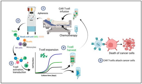 Overview of a general CAR T-cell manufacture process. Patient blood is collected through apheresis (1), and mononuclear cells are enriched using counterflow centrifugation and immunomagnetic bead-based T-cell selection (2). These T-cells are then activated and transduced with a vector encoding the CAR, which randomly inserts the CAR gene into the T-cell genome (3). The T-cells are expanded, and stimulatory beads are removed before infusion (4). After lymphodepleting chemotherapy, CAR T-cells can be infused into the patient, either as a single dose or, as shown here, in escalating doses over consecutive days or weeks; the latter treatment scheme is more often applied in clinical trials, as most FDA-approved products rely on a single dose. Once infused, these CAR T-cells proliferate and target cancer cells (5). (Created in BioRender, https://BioRender.com/d07f736 (accessed on 18 January 2025)).