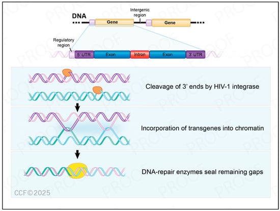 The ability of oncoretroviral and lentiviral vectors to stably insert the payload into the host’s genome has been a strong driver of research on safety and efficacy of this mode of gene correction [32,33,34,35,36]. The steps included in this process are summarized in Figure 2. Once the virus enters the cells and has their RNA converted into DNA by the reverse transcriptase, the integration process starts. An enzyme, namely integrase, cleaves the long terminal repeats (LTR) located at edge of the proviral DNA and incorporates the transgene into the host’s chromatin. DNA-repair enzymes are responsible for sealing gaps and finishing the integration process [13].