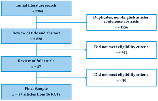 The final sample included 27 articles based on data from 16 RCTs. Figure 1 shows the study flow diagram. As shown in Table 1, a majority of these articles were published between the years 2020–2024 (n = 16, 59%), appeared in oncology journals (n = 14, 52%), were from the United States of America (n = 19, 70%), and had mixed cancer diagnoses (n = 19, 70%). Twenty-four (89%) articles included only patients with advanced cancer, while three (11.1%) also included some patients with localized disease. The median Jadad score was 2 (interquartile range 1–2). Four (15%) articles reported primary data from the RCT, while twenty-three (85%) were secondary analysis (Table 2).