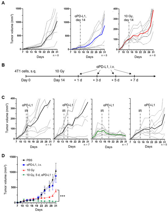 Figure 1. PD-L1 antibody at 5 days after radiation leads to tumor suppression. (A) 4T1 tumors were established in BALB/c immunocompetent mice at day 0 and treated at day 14 with PBS, anti-PD-L1, or 10 Gy, showing individual tumor growth profiles (dotted lines) and mean (bold solid lines, black, blue, and red lines corresponding to those shown in (D)). (B) Schema for combination therapy where tumors irradiated on day 14 are treated with anti-PD-L1 after 1, 3, 5, or 7 days. (C) Growth profiles for individual tumors (dotted lines) and mean (bold solid lines, green line corresponding to that shown in (D)) for combination treatment, with timing as indicated. (D) Mean tumor size for each group comparing controls to optimal combination therapy. *** p < 0.01, n = 7–8.