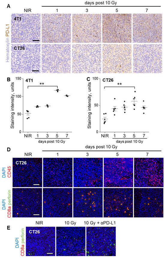 Figure 2. PD-L1 expression and TIL accumulation after radiation. (A) PD-L1 immunohistochemistry in 4T1 and CT26 tumors treated with 10 Gy and harvested after 1, 3, 5, or 7 days. Relative quantification of PD-L1 expression in (B) 4T1 and (C) CT26 tumors. Mean ± SE. (D) Tumor sections were stained with anti-CD45 (red) or anti-CD8a (red) and anti-perforin (green) and DAPI (blue). (E) Tumors treated with 10 Gy alone or with anti-PD-L1 at 5 days and harvested at 7 days and stained with anti-CD8a (red) and anti-perforin (green). ** p < 0.01. Scale bars: 50 µm.