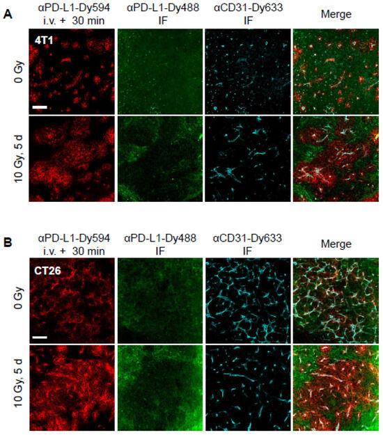 At 5 days after 4T1 and CT26 tumors were irradiated with 10 Gy, mice were injected i.v. with anti-PD-L1-DyLight 594 (0.2 mg in 0.1 mL PBS) and tumors excised after 30 min. Tumors were embedded in Tissue-Tek O.C.T. Compound (Sakura FineTek, Torrance, CA, USA), frozen at −80 °C, and sectioned at −20 °C. Sections dried at room temperature were rehydrated in PBS, stained with anti-PD-L1-DyLight 488 and anti-CD31-DyLight 633, washed, and imaged with an SP8 confocal microscope (Leica Microsystems).