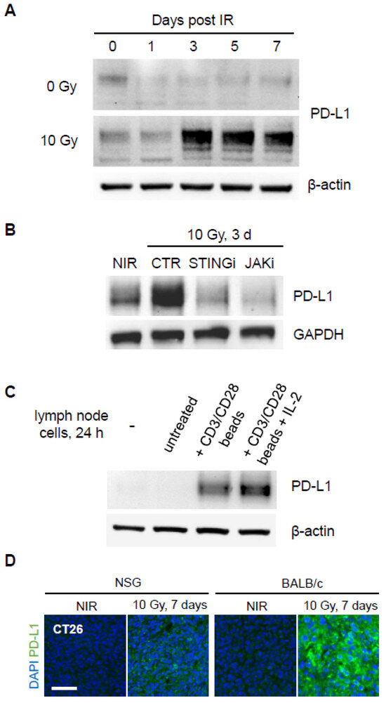 Figure 4. Intrinsic vs. paracrine PD-L1 upregulation in response to radiation. (A) CT26 cells were treated with 0 or 10 Gy and incubated for the indicated time, and then cell lysates were examined by anti-PD-L1 immunoblot. (B) CT26 cells were treated with 1 μΜ STING or JAK inhibitor prior to 0 or 10 Gy irradiation and cell lysates isolated after 3 days for anti-PD-L1 immunoblot. (C) CT26 cells were treated with the indicated agents or coincubated for 24 h with mouse lymph node cells, untreated, activated with anti-CD3/CD28 beads, or activated with anti-CD3/CD28 beads with IL-2 and lysates isolated for anti-PD-L1 immunoblot. (D) CT26 tumors in BALB/c or NSG mice were treated with a single 10 Gy dose, isolated after 7 days, stained with anti-PD-L1 antibody, and imaged by immunofluorescence. Scale bar: 100 µm.