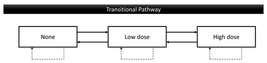 Possible behavior change pathways of smoking and betel quid chewing. None: never or cessation; Low dose: using less than 20 values per day; High dose: using 20 and higher values per day.