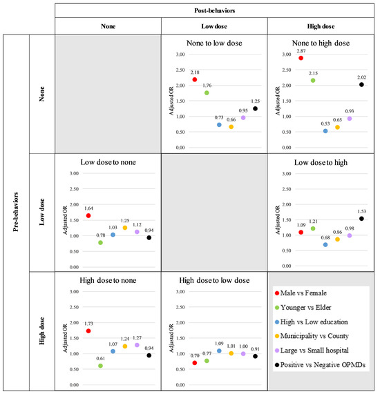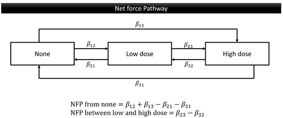 The demographics of this data, including the gender, age group, education level, living area, screening place, OPMDs, and oral cancer, were summarized as frequency and percent. The Markov chain model provides an investigation of the transitional probability of deteriorating, maintaining, or improving. Using the exponential regression form representing behavior weights for respective progression and regression, we translated three transition parameters into the following two patterns of Net Force Progression (NFP): the NFP from none and the NFP between low and high doses. The NFP from none was calculated by subtracting any regressions to the none stage from progressions from the none stage. This was performed to analyze the tendency to initiate oral risky behavior compared to ceasing such behavior. The NFP between the low and high doses was determined by subtracting the regressions from the high to low dose from the progressions from the low to high dose so to study the trends in increasing or decreasing the daily dosage of oral risky behaviors (Figure 2). This study categorized missing data as one level of the data, allowing for adjustments during the analysis. The investigation on transitional probabilities and associated factors for behavior change was conducted using Markov chain Monte Carlo (MCMC) estimation. All of the analyses were performed using SAS version 9.4 (SAS Institute, Cary, NC, USA).