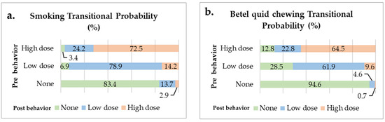 Transitional probability for each behavior type (a) of smoking and (b) betel quid chewing.