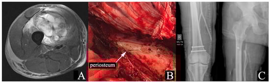 Seventy-one-year-old male with right thigh pleomorphic rhabdomyosarcoma. The patient was treated with 50 Gy of neoadjuvant RT. (A) MRI STIR sequence demonstrating proximity of the tumor to the femur, without invasion. (B) Intraoperative image showing periosteal stripping of the femur. (C) Plain radiographs displaying after periosteal stripping and RT. MRI: magnetic resonance imaging; STIR: Short Tau Inversion Recovery; RT: radiation therapy.
