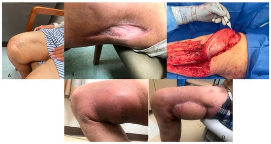 Multiple clinical images of patients with soft tissue sarcoma treated with soft tissue reconstruction. The reconstructive ladder was followed, performing procedures of increasing complexity, including (A) soft tissue rearrangement, (B) split-thickness skin graft, (C) rotational flap (gastrocnemius), and (D) myocutaneous free flap.