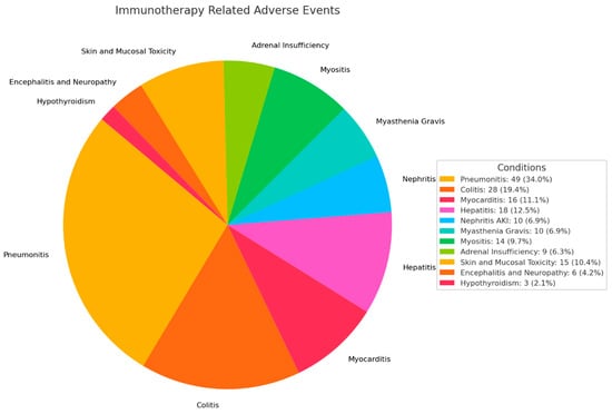 The most common irAEs in order of prevalence were pneumonitis (49, 34.0%), colitis (28, 19.4%), hepatitis (18, 12.5%) and myocarditis (16, 11.1%) (Figure 1).