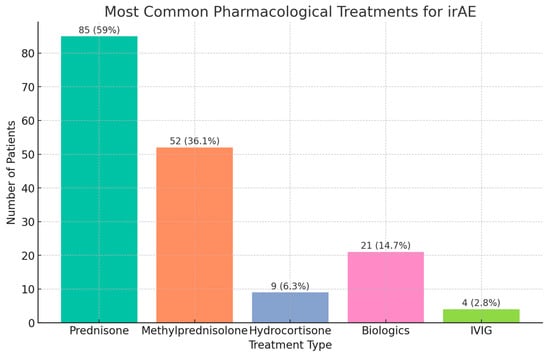 The pharmacological treatments most employed in the management of irAEs were prednisone (85, 59.0%), methylprednisolone (52, 36.1%), hydrocortisone (9, 6.3%), biologics (21, 14.7%) Rituximab, Infliximab, and Vedolizumab, and intravenous immunoglobin (4, 2.8%). Primarily supportive measures were required in 76 (53.1%) of the patients with irAEs (Figure 3).