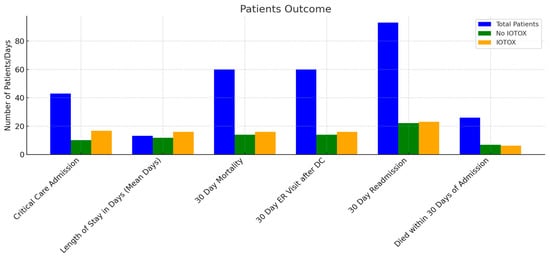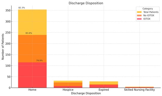 Of the 144 IOTOX patients, 131 were discharged. Discharge dispositions included home, 115 patients (79.9%); hospice, 8 (5.6%); a skilled nursing facility, 3 (2.1%); long-term acute care, 3 (2.1%) (Figure 5). One patient was transferred to another hospital, and one left against medical advice. The 30-day ER visit rates were 38 (26.6%) in the IOTOX group vs. 65 (23.5%) in the NO IOTOX group (p = 0.55). Within the IOTOX group, 15 (15.6%) had an ER visit within 30 days for the same irAE.