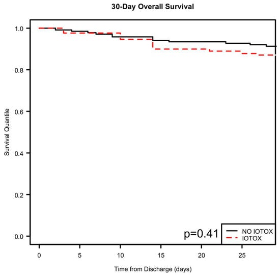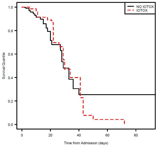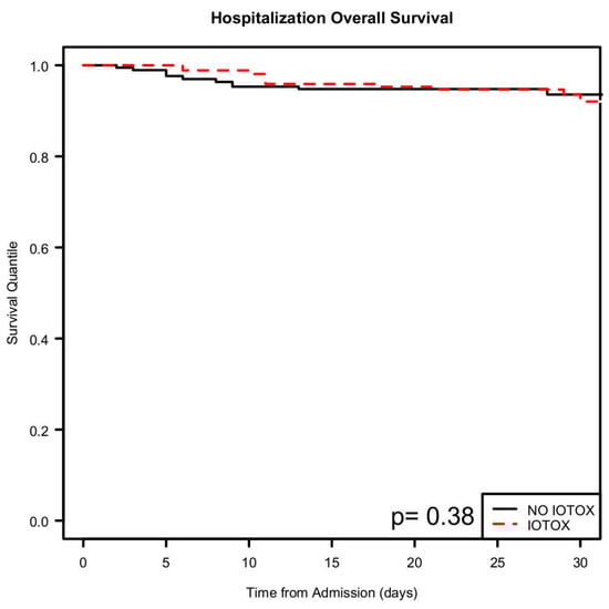 Patients in the IOTOX group were more likely to require ICU admission during the hospitalization (OR 4.02 [CI 1.58–10.26]; p = 0.004). Of the 144 IOTOX patients, 114 (79.2%) were noted to have clinical improvement in the irAE during the hospitalization defined as improvement in symptoms and clinical status. Lengths of stay for the IOTOX vs. NO IOTOX groups were 11.3 days vs. 10.8 days, respectively (Figure 4) (Table 4).