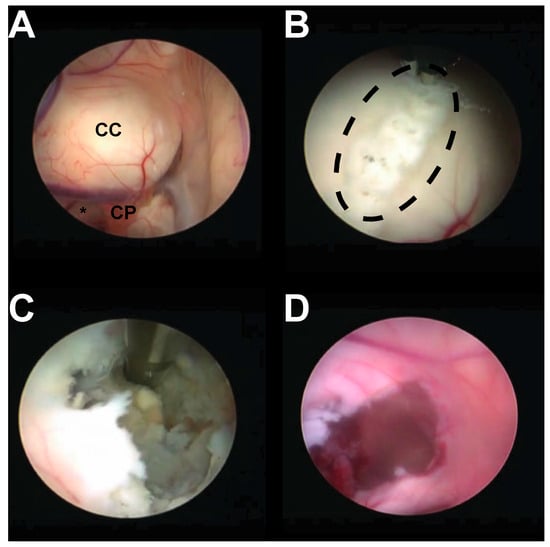 Intraoperative finding. (A) Intraoperative image showing a large protruding mass behind the septum pellucidum (CC); notably, the foramen of Monro (asterisk) is normal sized; choroid plexus (CP) is also appreciated. (B) Following cyst identification, a septostomy (dashed line) is performed with bipolar cautery. (C) Once the cyst is accessed, cyst contents are removed in a stepwise fashion. (D) Following cyst resection, the cavity is inspected to confirm homeostasis.
