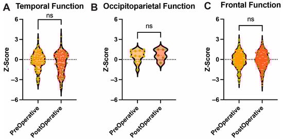 Anatomical Function. Box and Violin plots showing no difference between pre- and postoperative performance in temporal (A), occipitoparietal (B), and frontal (C) functions. Ns = not significant.