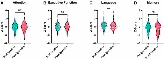 Higher Cognitive Functions. Box and Violin plots showing no difference between pre- and post-operative performance in attention (A), executive function (B), language (C), and memory (D). Ns = not significant.