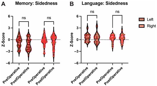 Sidedness of Memory and Language. Box and Violin plots showing no difference between pre- and post-operative performance regardless of the sidedness of approach for both memory (A) and language (B) functions. Ns = not significant.