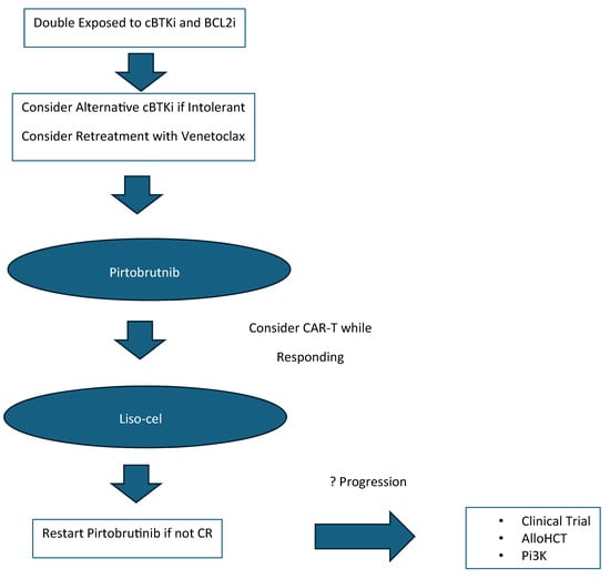 From the point that our patient under review was double refractory, she failed to respond to pirtobrutinib and ultimately declined liso-cel and pursued treatment with a fourth-generation BTK inhibitor LP-168 on a clinical trial. At the time of writing this review, the patient is currently responding to treatment with normalization of lymphocytosis and resolution of thrombocytopenia.