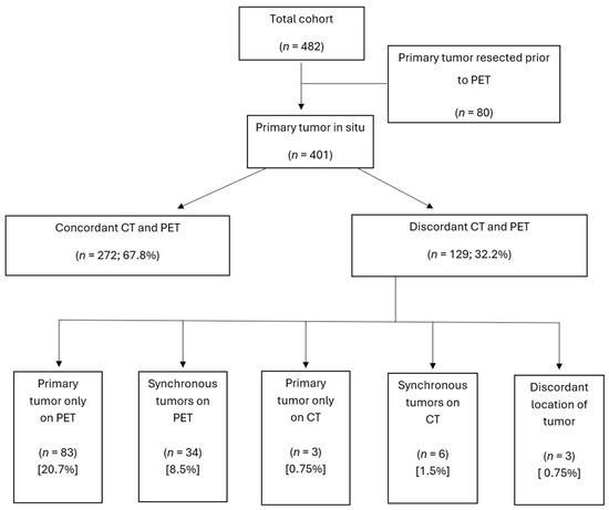 There were 81 patients whose primary tumor was resected prior to PET (Figure 1). PET and CI were concordant for the site of primary tumor in 272/401 patients (67.8%). PET suggested primary tumor sites not seen on CI in 117/401 patients (29.2%), including 83 patients in whom a primary tumor was not identified on CI, and 34 additional patients in whom synchronous primary tumors (such as multifocal small bowel tumors) were identified on PET. Of patients with metastatic NET of an unknown primary tumor site, 11/34 (32.3%) had primary tumors suggested on SSTR-PET.