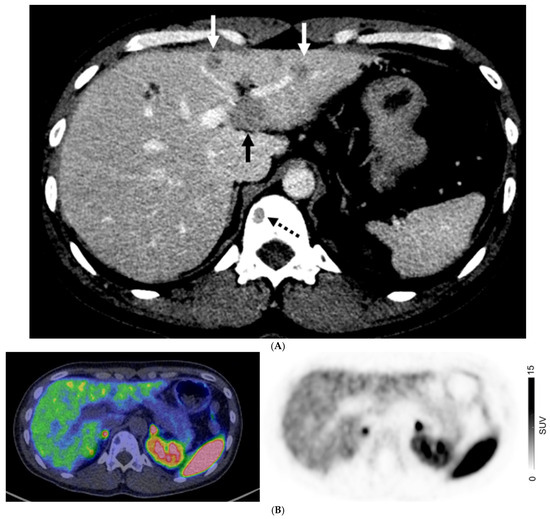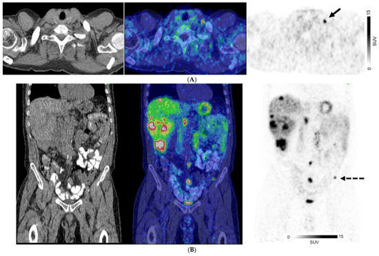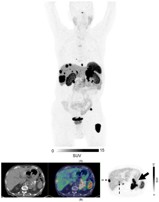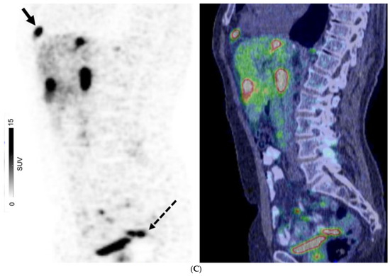 A 67-year-old man with well-differentiated G1 small bowel NET, Ki 67 = 3% metastatic to liver. Staging CT showed mid-ileal tumor, regional nodal metastases, and bilobar liver metastases [CT stage: n1M1a]. 68Ga-DOTATATE PET/CT (A,B) Axial and Coronal—CT (left), fused PET/CT (middle) and PET (right); (C) Sagittal—Fused PET/CT (left) and PET (right) shows in addition, extrahepatic metastases including extraregional nodes including supraclavicular and cardiophrenic nodes (arrows in (A,C)), and peritoneal metastases (dotted arrows in (B,C)); overall, PET stage: n1M1c.