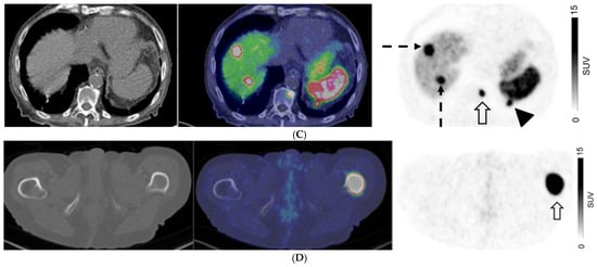 A 76-year-old man with well-differentiated G3 pancreatic neuroendocrine tumor (SUVmax 131.5, Krenning score 4), with bilobar liver metastases on CT. 68Ga-DOTATATE PET (A) MIP image; (B–D) Axial images: CT (left), fused PET/CT (middle), and PET (right). PET shows an intensely-avid locally advanced pancreatic tail mass (SUVmax = 132; solid arrow in (B)), liver metastases (biopsy proven; dotted arrows in (B,C)), peritoneal deposit (arrowhead in (C)) and bone metastases (open arrows in (C,D)).