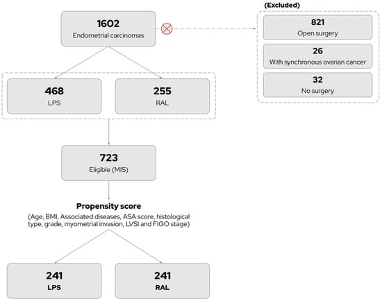 A stratified analysis was conducted comparing RAL and LPS. Qualitative variables are presented as frequency distributions. Quantitative variables are summarized using the mean and standard deviation (SD), while those with asymmetric distributions are described by the median and interquartile range (IQR). Discrete variables are presented as absolute frequencies and relative percentages. The propensity score matching technique was performed with the variables age at diagnosis, body mass index (BMI), pre-surgical comorbidities, American Society of Anesthesiologists (ASA) score, histological subtype, histological grade, myometrial invasion, lymphovascular space invasion, and FIGO stage, to homogenize the RAL group and the LPS group. To study the association between qualitative variables, a chi-squared test or Fisher’s exact test was conducted when appropriate. Comparisons between groups were studied by Student’s t-test with normal distribution. Mann–Whitney tests were used for non-parametrical variables.