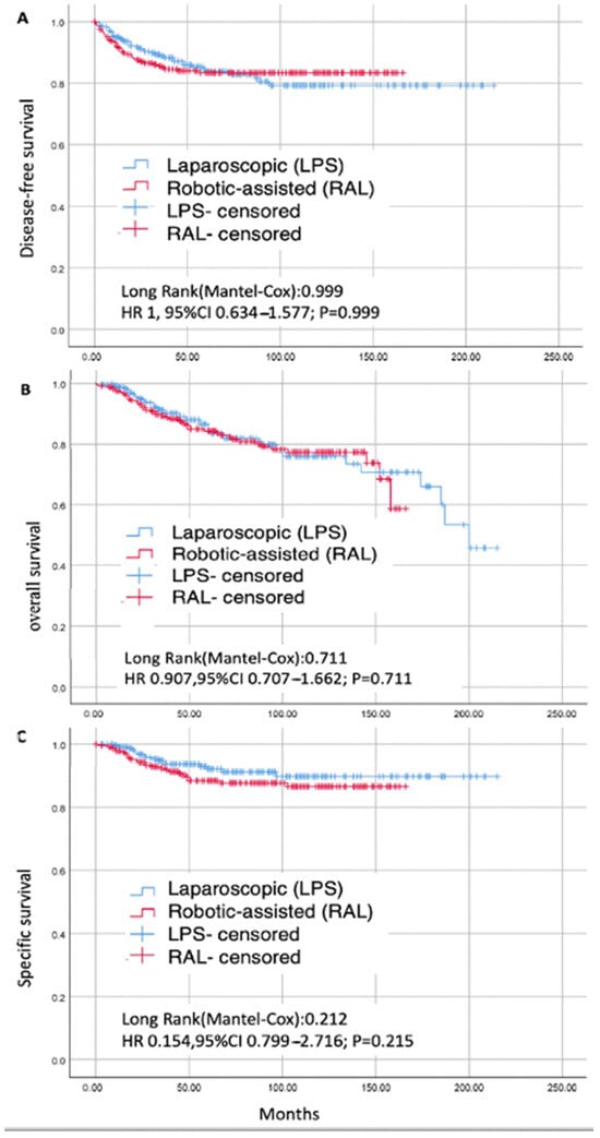 Kaplan–Meier curves were generated for the matched surgical groups. The hazard ratios, 95% confidence intervals, and corresponding p-values were calculated using Cox’s proportional hazards model. Panel (A) shows the disease-free survival curve, panel (B) presents the overall survival curve, and panel (C) depicts the specific survival curve.