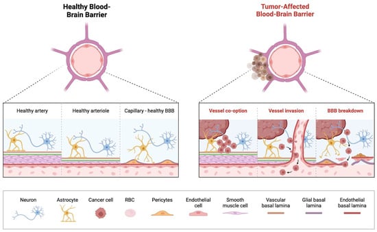 Overview of Blood-Brain Barrier Alterations in Pediatric Brain Tumors. On the (left) is an illustration of the healthy BBB with correctly functioning arteries, arterioles and capillaries. On the (right) is an illustration of the breakdown of the BBB that takes place in a tumor-affected brain, with vessel co-option by the tumor and subsequent invasion of the vessel resulting in the breakdown of the previously healthy BBB.