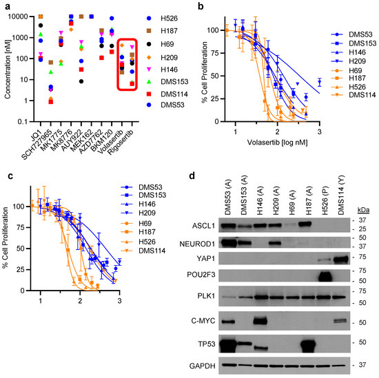 - Mollaoglu, G.; Guthrie, M.R.; Bohm, S.; Bragelmann, J.; Can, I.; Ballieu, P.M.; Marx, A.; George, J.; Heinen, C.; Chalishazar, M.D.; et al. MYC Drives Progression of Small Cell Lung Cancer to a Variant Neuroendocrine Subtype with Vulnerability to Aurora Kinase Inhibition. Cancer Cell 2017, 31, 270–285. [Google Scholar] [CrossRef]