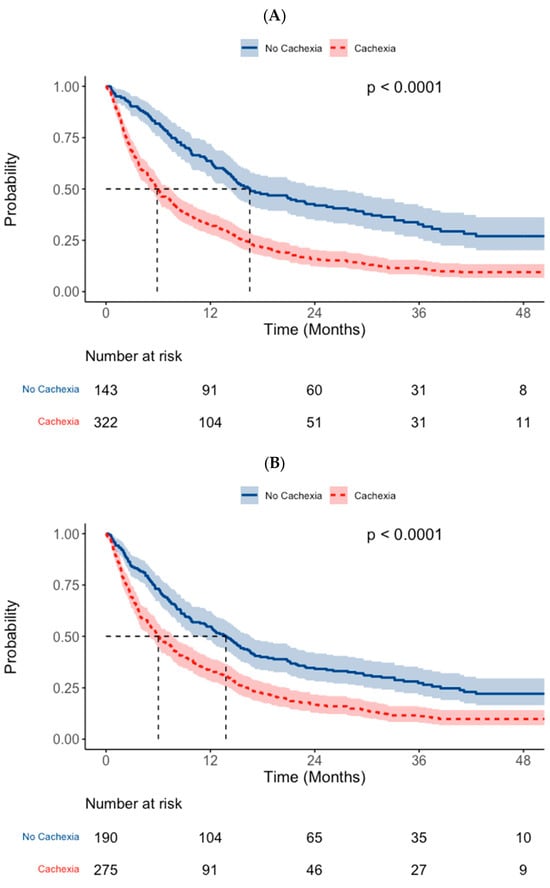 | No Cachexia (n = 114) | Cachexia (n = 217) | p Value | No Cachexia (n = 150) | Cachexia (n = 181) | p Value | ||