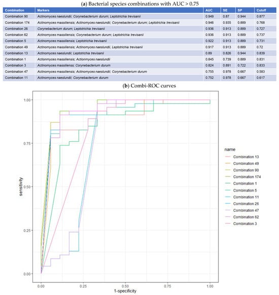 | Species with AUC > 0.800 (n = 10) a | p-Value b | AUC c | Threshold d | SE e | SP f | A g | BCDavg h | FC i | BCD Increase or Decrease j | HPV− k | HPV+ l | FC m | HPV+ Higher or Lower n |