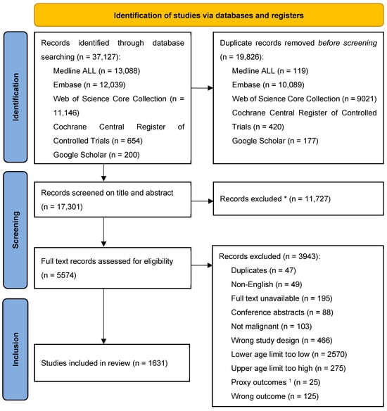 Flow chart of the article selection process. * No automation tools were used. 1 Articles describing outcomes of proxies solely and not those of AYAs were excluded.