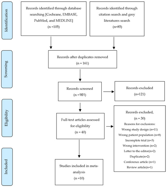 The systematic search initially retrieved 190 articles. Following the elimination of duplicates, title and abstract screening, and full-text review, ten RCTs were considered suitable for meta-analysis and systematic review (Figure 1).