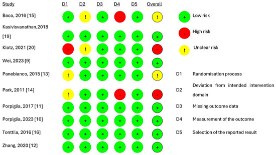 Figure 2 presents the quality of evidence from the included studies, indicating that six studies [9,10,11,12,16,19] had a low risk of bias. However, two trials [13,15] raised concerns, while two trials [14,20] exhibited a high risk of overall bias. The main reason for this was the absence of details regarding randomisation and the blinding of the pathologic evaluation of biopsy tissues. The assessment of publication bias was not completed due to the inclusion of only ten studies.
