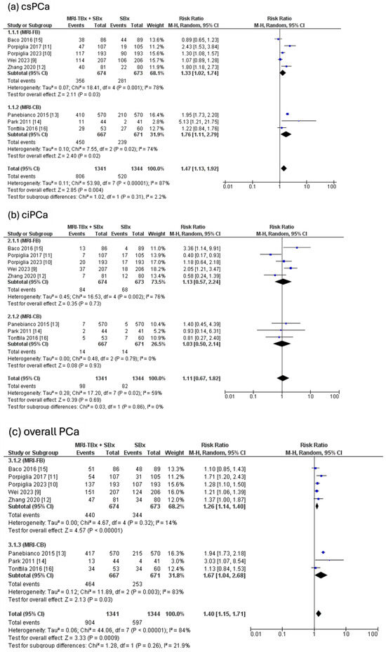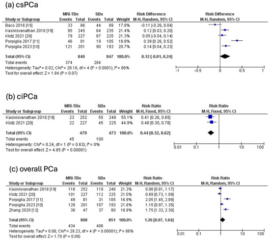 Five RCTs were analysed, revealing that there were no significant differences in the DR of csPCa using MRI-TBx compared to SBx (RR = 0.12, 95% CI = 0.01,0.24, p = 0.07, I2 = 86%, Figure 4a). Two RCTs were analysed for ciPCa, showing that in contrast to MRI-TBx (CB or FB), SBx demonstrated a considerably higher DR of ciPCa (RR = 0.44, 95% CI = 0.32, 0.62, p < 0.00001, I2 = 0%, Figure 4b). Five RCTs were analysed for the overall PCa and revealed no significant differences in the DR of PCa between methods (RR = 1.26, 95% CI = 0.97, 1.64, p = 0.09, I2 = 86%, Figure 4c).