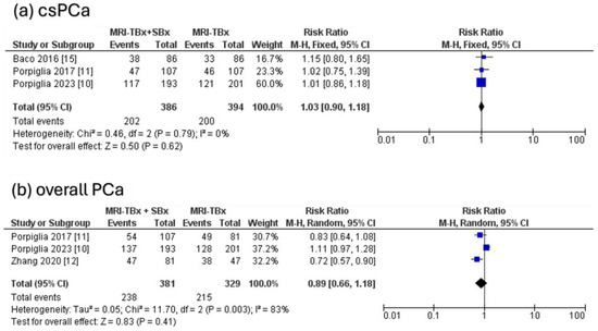 For csPCa, the three RCTs analysed indicated no significant difference in the DR between the combined strategy (MRI-TBx + SBx) and the MRI-TBx method (RR = 1.03, 95% CI = 0.90, 1.18, p = 0.62, I2 = 0%, Figure 5a). For ciPCa, the DR using MRI-TBx were not reported in all trials, preventing the calculations. There was no significant difference in overall PCa DR between MRI-TBx + SBx and MRI-TBx method alone (RR = 0.89, 95% CI = 0.66, 1.18, p = 0.41, I2 = 83%, Figure 5b).