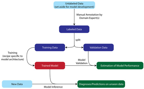 A diagrammatic overview of the model development workflow for supervised machine learning, from data annotation through training and validation to production-ready inference.