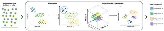 Unsupervised learning algorithms. Labelled cells with unknown identities are analyzed by flow cytometry and partitioned in the feature space based on marker expression. Clustering methods are used to group data points based on their marker profiles, while dimensionality reduction can be applied to high-parameter datasets to simplify their representation and enhance the biological interpretability. These tools output cell annotations to identify distinct populations, enabling the characterization of disease states and facilitating novel discoveries.