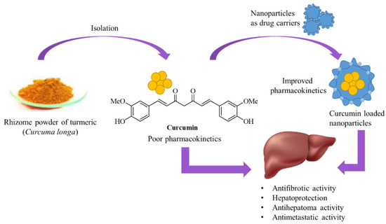 The therapeutic application of curcumin is critically limited because of its hydrophobic nature, unstable chemical structure, rapid hydrolysis, and poor absorption. Chemical modification can address some of these limitations, but guided organotropism remains challenging. There have been efforts to overcome these challenges by the design and synthesis of nanocarrier liposomes to establish better permeability, higher absorption, greater stability for longer circulation, and improved resistance to the rapid metabolic hydrolysis of curcumin in the body, improving hepatic delivery for the therapy of (non-)malignant liver disease (Table 1).
