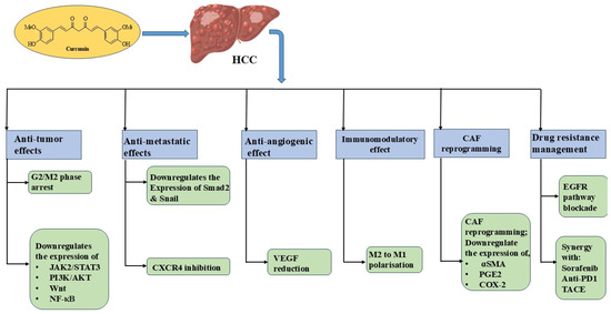 Hepatocellular carcinoma (HCC) is the most prevalent form of primary liver cancer. Despite recent advancements in therapeutic strategies, including immunotherapy, the median overall survival rate of patients with advanced stage of HCC is limited to 2 years. This poor prognosis in the advanced stage suggests the urgent need of pharmacological agents, using different mechanisms, in addition to established regimes [15,16]. Curcumin might offer an additional therapeutic benefit to established regimens, as it inhibits HCC through multiple mechanisms (Figure 2). First, it suppresses cell proliferation by G2/M phase cell cycle arrest in HCC [17]. Second, growth inhibition and apoptosis induction by curcumin occurs by the downregulation of JAK2/STAT3 and PI3K/AKT signaling [9,18,19,20]. Third, curcumin-mediated HCC cell death involves other forms of programmed cell death, such as pyroptosis, ferroptosis, cuproptosis, necroptosis, and autophagy [11,13,16,21]. Fourth, curcumin regulates the expression of various miRNAs in HCC, leading to cell death [22,23,24]. Fifth, tumor-related cell proliferation and inflammation are inhibited by interfering with the Wnt signaling and NF-κB pathways [25,26,27]. In addition to its effect on established tumors, curcumin inhibits metastasis formation and epithelial–mesenchymal transition (EMT) by the suppression of Smad2 and Snail [28]. Beyond this, curcumin exerts a distinct effect on the surrounding tumor tissue, the tumor microenvironment (TME). Curcumin has an antiangiogenic effect, hampering the supply of oxygen and nutrients to the tumor [29,30]. In this regard, VEGF is one of the most proangiogenic factors, which is mainly responsible for neovascularization in tumors [31]. Curcumin decreases VEGF serum levels in different murine models of HCC, thereby inhibiting neovascularization and restraining tumor growth and HCC development [32]. Curcumin also possesses an immunomodulatory effect in the TME. It polarizes M2 tumor-associated macrophages towards the M1 antitumor phenotype and impedes the recruitment and aggregation of myeloid-derived suppressor cells [33]. In addition to its effect on immune cells, curcumin also affects the stromal compartment in the TME, which represents the largest portion of the TME [34]. Similar to macrophages, cancer-associated fibroblasts (CAFs) are reprogrammed by curcumin towards an immunocompetent phenotype [35]. In the study, CAFs were extracted from breast cancer tissue treated with curcumin ex vivo and, subsequently, cocultured with corresponding peripheral blood mononuclear cells (PBMCs). The curcumin treatment reduced CAF-related markers, such as α-SMA, COX-2, and the production of PGE2 in CAFs, as well as markers for immunosuppression, e.g., FoxP3, TGF-β, IL-10, and IL-4, while IFN-γ production was upregulated in PBMCs.