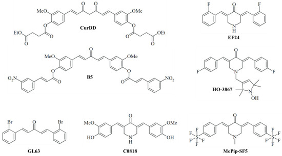 Monocarbonyl analogs of curcumin (MACs) are an especially prolific class of anticancer active curcuminoids [45]. These include B5, EF24, HO-3867, GL63, C0818, and MePip-SF5.