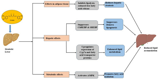 The lipid-lowering effect of curcumin has gained attention for its potential in managing conditions related to dyslipidemia [61]. By reducing elevated levels of cholesterol and triglycerides, curcumin acts as an effective antilipidemic agent, optimizing lipid homeostasis [62]. This lipid-lowering effect of curcumin contributes to the prevention and treatment of fatty liver diseases [63]. By inhibiting lipolysis, curcumin prevents free fatty acid (FFA) release from adipose tissue, reducing hepatic steatosis. It also suppresses factors like carbohydrate response element binding protein (ChREBP) and sterol regulatory element binding protein (SREBP1c), which decrease de novo lipogenesis (DNL). This makes curcumin a promising therapeutic option in addressing metabolic disorders, such as MASLD or MASH [64].