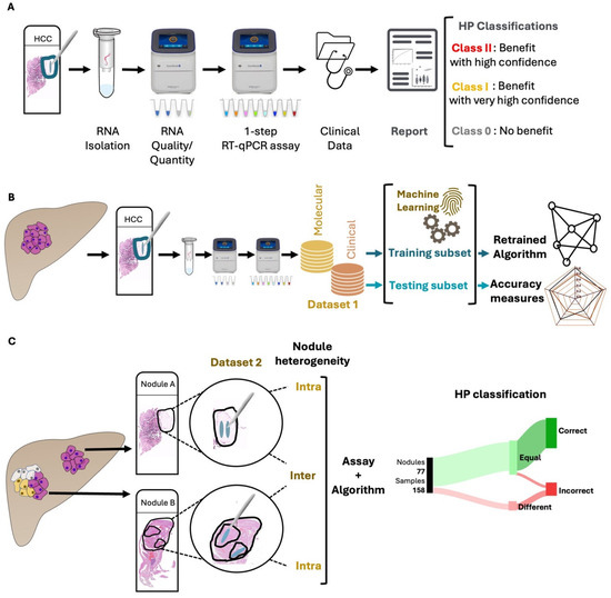 Methodology Workflow. All collected samples were tested, individually, as previously described [27,28] using the HepatoPredict molecular assay and algorithm (A). In Dataset 1, RNAs were isolated from FFPE liver explant HCC nodules and analyzed with the HepatoPredict molecular assay. The molecular and clinical variables from Dataset 1 samples were used to retrain the HepatoPredict algorithm using machine learning approaches and to calculate accuracy measures for the new version (B). In Dataset 2, at least two representative samples, mimicking a tissue biopsy, were collected from both homogeneous and heterogeneous nodules, based on a pathologist’s analysis of a hematoxylin-eosin-stained slide. The performance of HepatoPredict was then assessed in samples isolated from the same nodule (to investigate the impact of intra-nodule heterogeneity), as well as in samples isolated from distinct nodules within the same patient (to explore the effects of inter-nodule heterogeneity) (C).