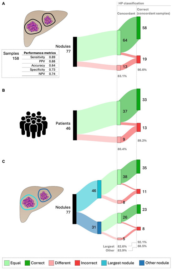 HepatoPredict performance in the context of intra-nodule heterogeneity—concordance and correct prediction in concordant samples. To evaluate the impact of intra-nodule heterogeneity on HP performance, at least two samples of each nodule were collected and characterized regarding the concordance of their HP assay results, specifically, whether these samples from the same nodule received the same HP classification. The performance of HP, defined as its ability to produce correct prognoses, was evaluated using only the HP-concordant samples. HP performance metrics for Dataset 2, which includes data from 158 samples, are shown (A). This analysis was further performed for individual patients (B) and the results from the largest nodules were also compared with those from other nodules (C). The number (N) and percentage (%) are indicated for nodule/patients showing concordant vs. different HP results and for concordant samples. Any instance where the HP algorithm produced discordant results was automatically classified as incorrect.