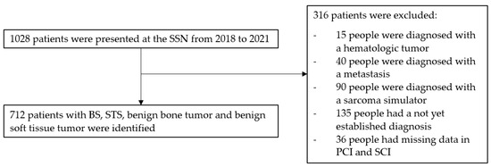 All consecutive patients presented at the weekly MDT/SB-SSN meetings with a diagnosis of STS, BS, BSTT or BBT between 1 January 2018 and 31 December 2021 were considered for inclusion. Diagnoses were established based on the World Health Organization (WHO) classification and categorized as benign or malignant, with intermediate tumors classified as sarcomas (see Figure 1).
