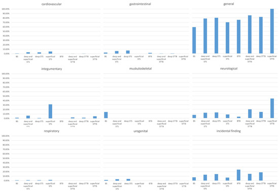 Distribution of Symptom Prevalence (%) Across Different Tumor Groups Categorized by Symptom Class: Circulatory, Gastrointestinal, General, Integumentary, Musculoskeletal, Neurological, Respiratory, Urogenital and Incidental Findings. For a detailed tabular representation and numerical data, please refer to Table A2 in Appendix A.