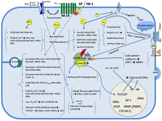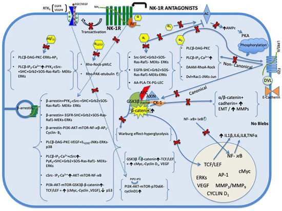 NK-1R antagonists, via the NK-1R, block these pathways and inhibit the effects mediated by SP on tumors. Abbreviations: AA, arachidonic acid; AC, adenylate cyclase; AKT or PKB, protein kinase B; APC, adenomatous polyposis coli; CK-1, casein kinase 1; DAAM, disheveled-associated activator of morphogenesis; DAG, diacylglycerol; Dvl; disheveled; EGF, epidermal growth factor; EGFR, epidermal growth factor receptor; EMT, epithelial–mesenchymal transition; ERK1/2, extracellular signal-regulated protein kinase; Fzd, frizzled; GSK3β, glycogen synthase kinase 3β; HK-1, hemokinin-1; IP3, inositol trisphosphate; LEC, leukotriene; LRP5/6, low-density lipoprotein receptor-related protein 5/6; MAPKs, mitogen-activated protein kinases; MEKs, mitogen-activated protein kinase kinases; MMPs, matrix metalloproteinases; NF-κB, nuclear factor kappa B; PKC, protein kinase C; PG, prostaglandin; pMLC, myosin light-chain kinase; PI3K, phosphoinositide 3-kinase; PLA, phospholipase A; PLC β, 1-phosphatidylinositol-4,5-bisphosphate phospholipase beta; ROCK, Rho-associated kinase; RTK, receptor tyrosine kinase; TCF/LEF, T-cell factor/lymphoid enhancer-binding factor; TNFα, tumor necrosis factor alpha; TX, thromboxane; VEGF, vascular endothelial growth factor.